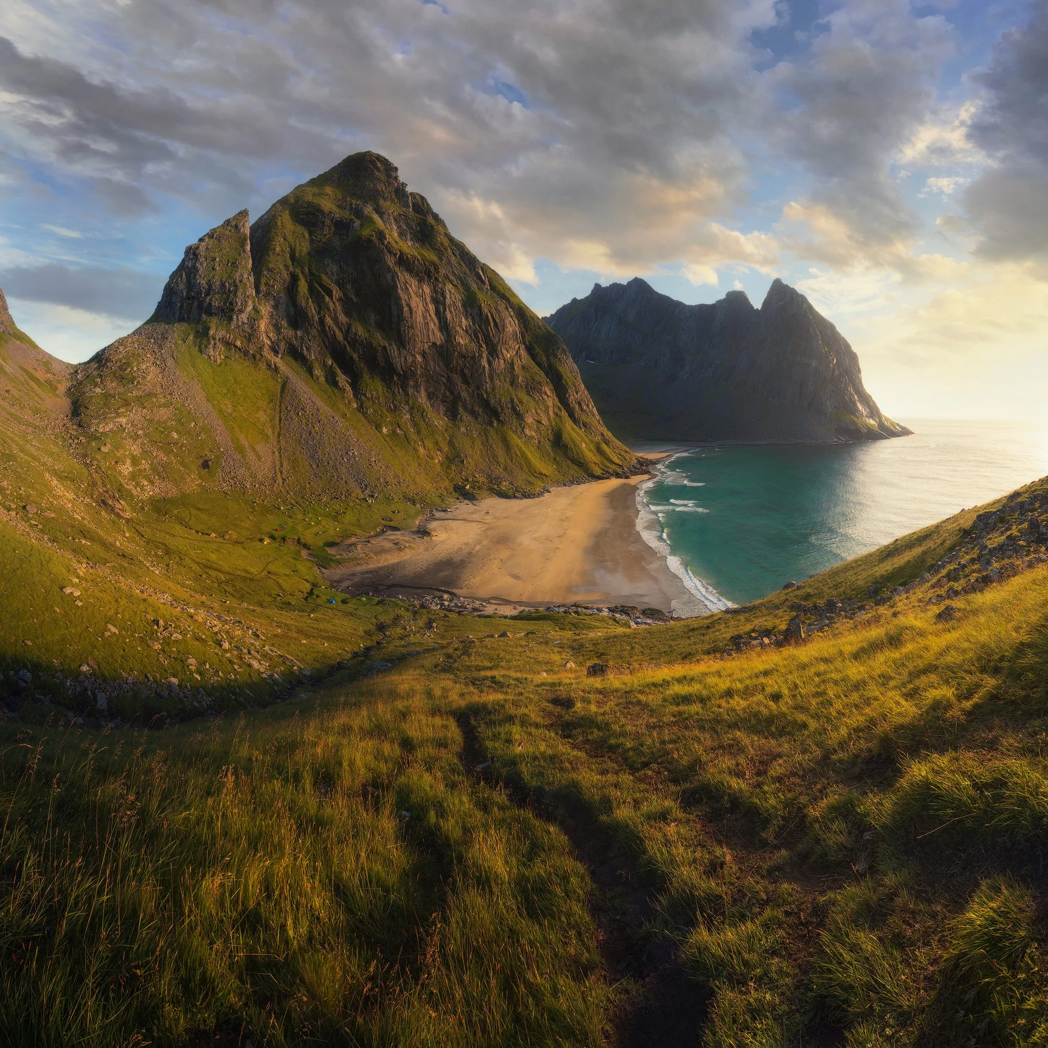 Midnight Sun in Kvalvika Beach, Lofoten Islands