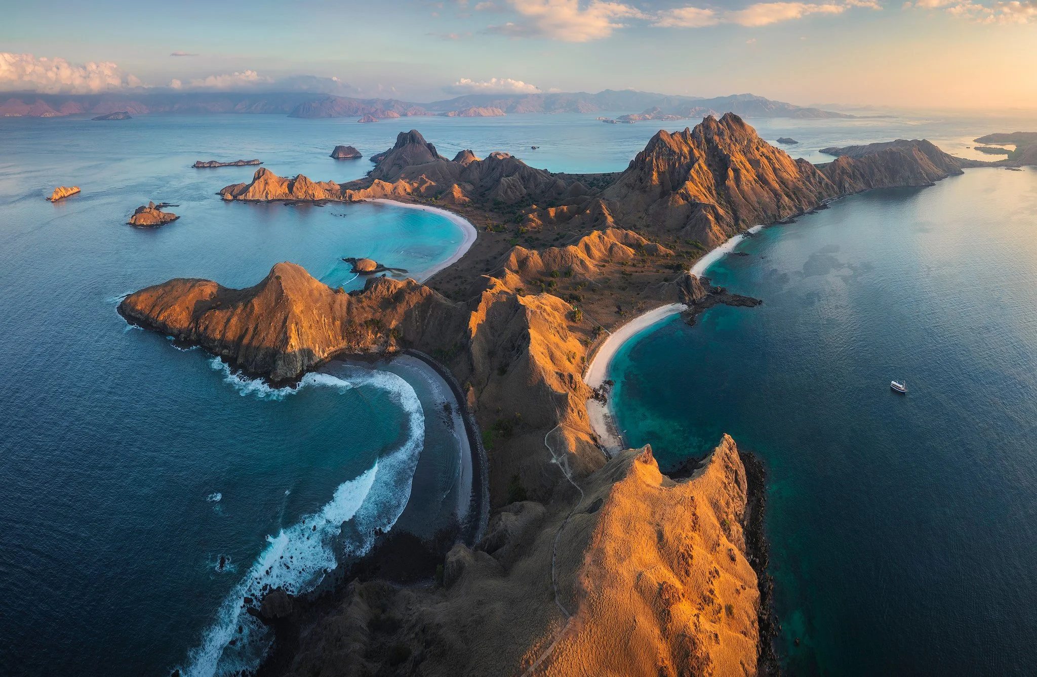 The soft hues of dawn blanket Padar Island in Komodo National Park, Indonesia as the first light of day spills across the rugged terrain.