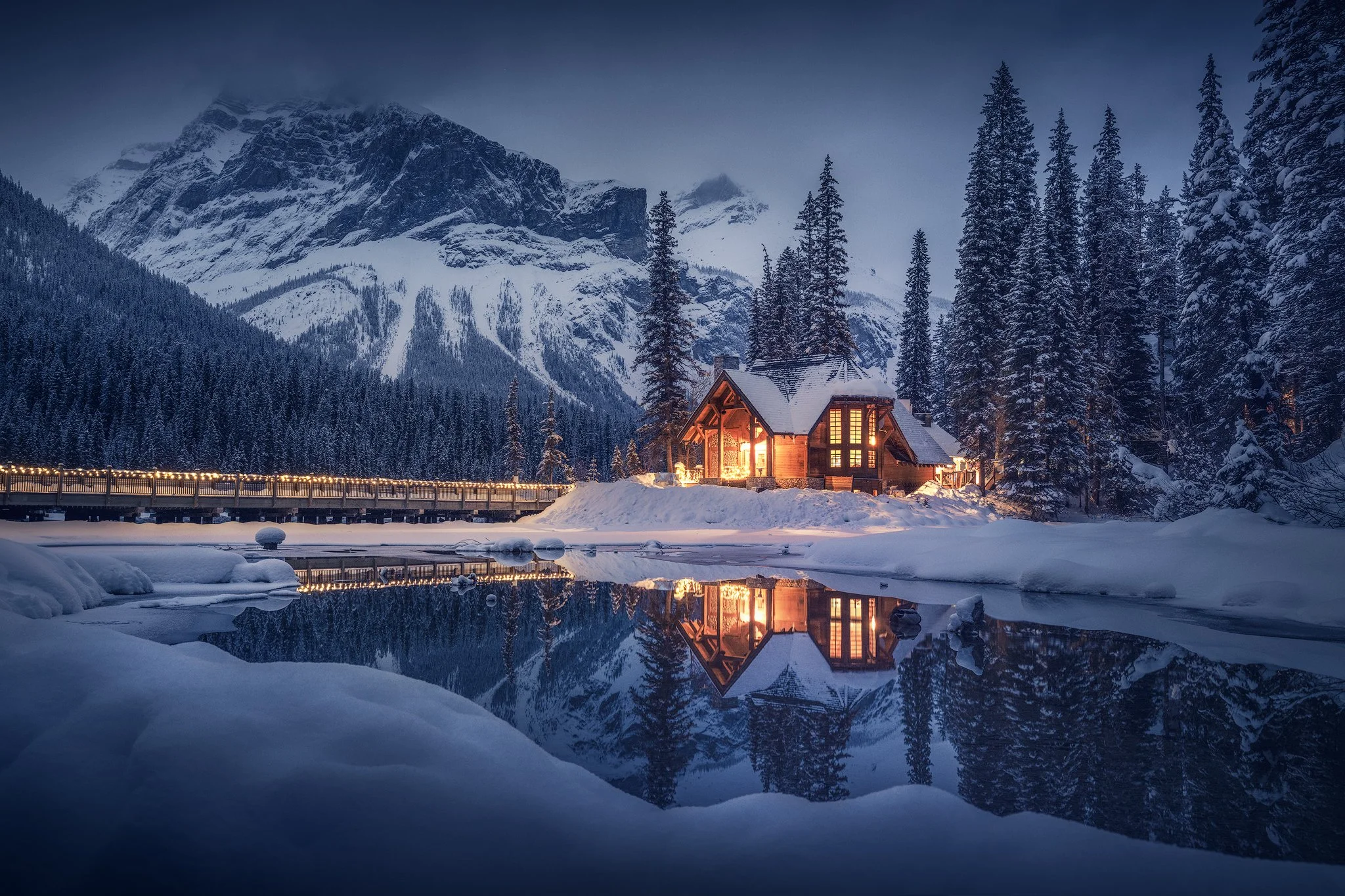 Emerald Lake in Canada is a stunning destination that captures the beauty of winter, often evoking nostalgic memories of Christmas times. The sight of cozy lodges, often decorated with festive lights, adds a touch of magic to the scene.