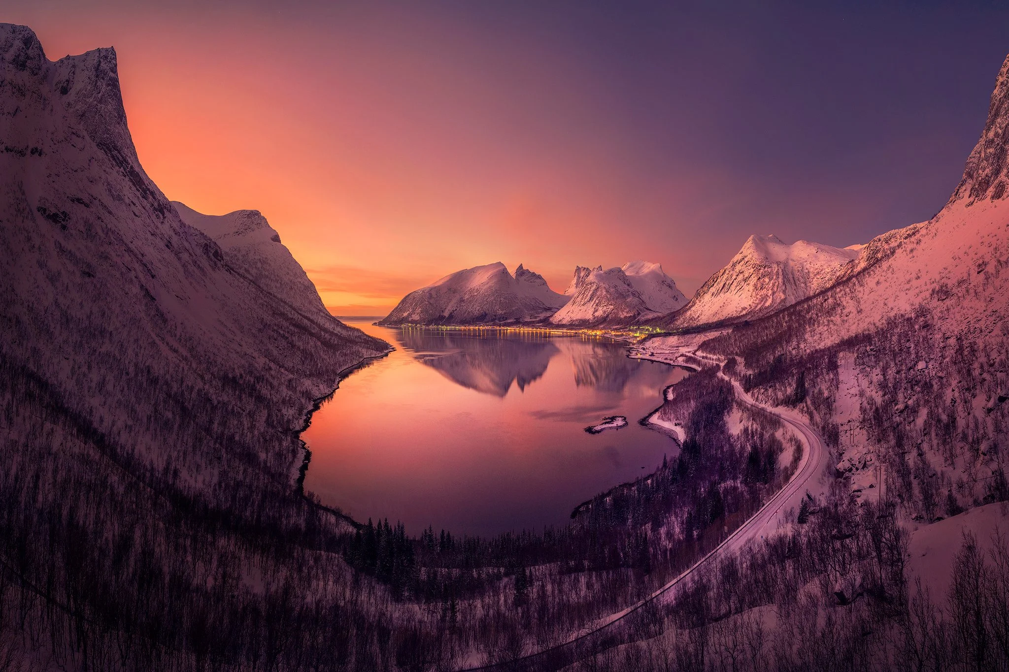 The Arctic Fjords of Norway, particularly in Senja during winter, offer a breathtaking contrast of rugged terrain and serene landscapes.