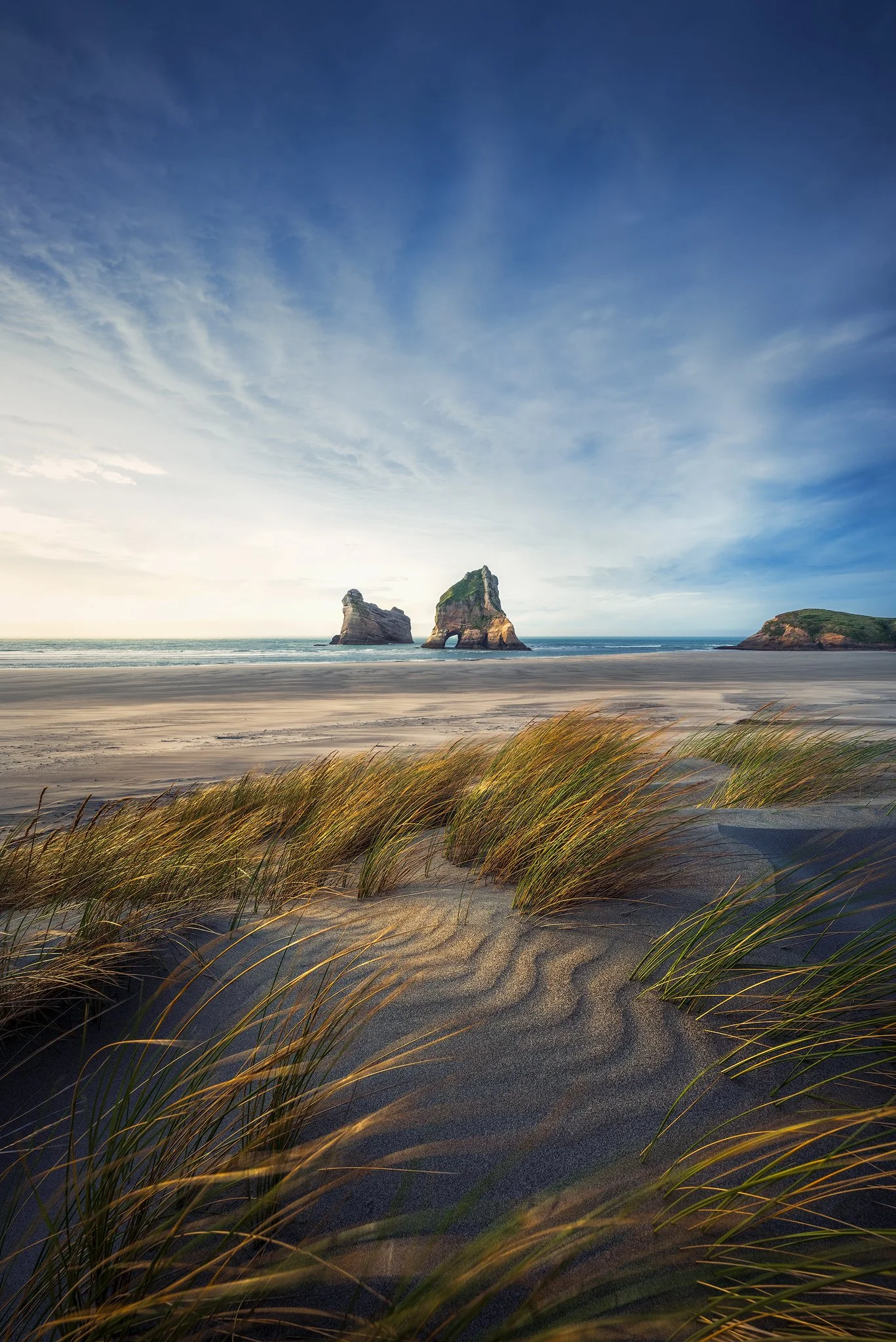 Wharariki Beach, located on the west coast of New Zealand's South Island, is a stunning natural beauty and dramatic landscape., where the famous Wharariki Sea Arch and the striking stacks rise from the ocean.