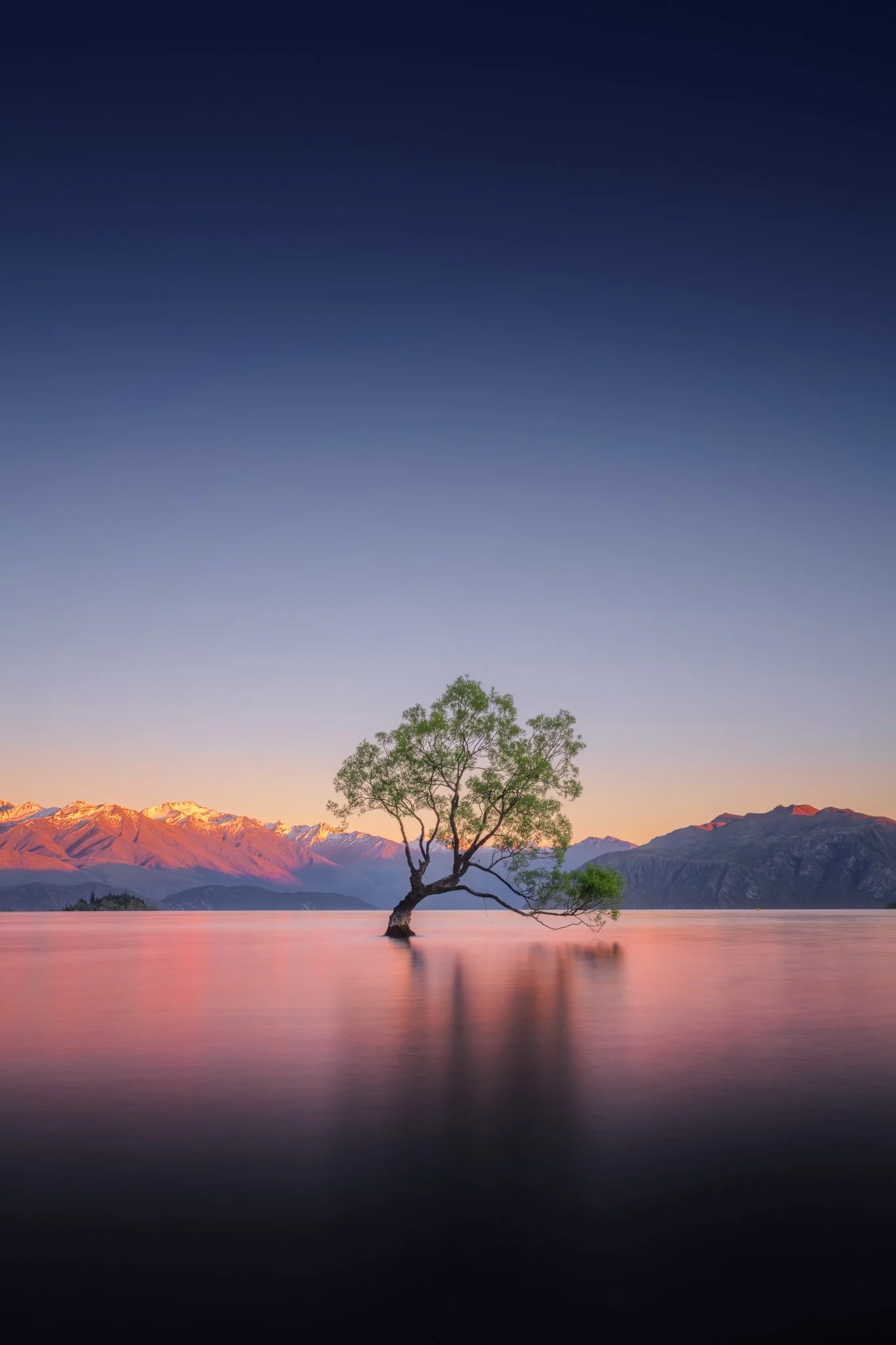 The Wanaka Tree, a solitary willow, stands gracefully in the waters of Lake Wanaka in New Zealand, framed by towering mountains.